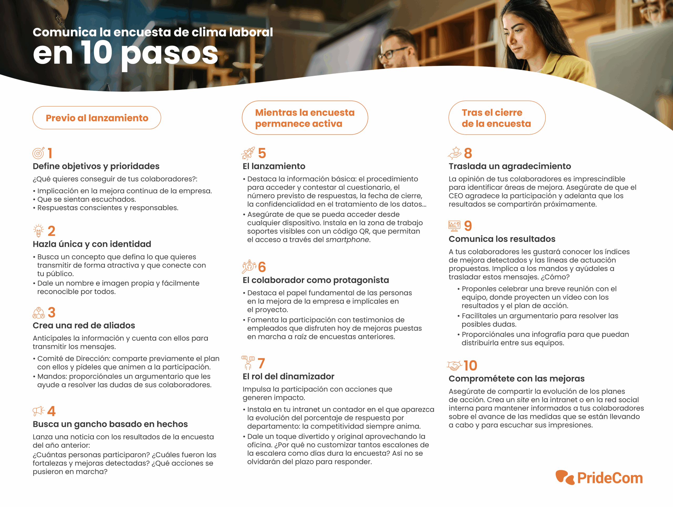 Para que tengas presentes los imprescindibles a la hora de comunicar con éxito antes, durante y después del lanzamiento de tu encuesta de clima, ¡no te pierdas esta guía!