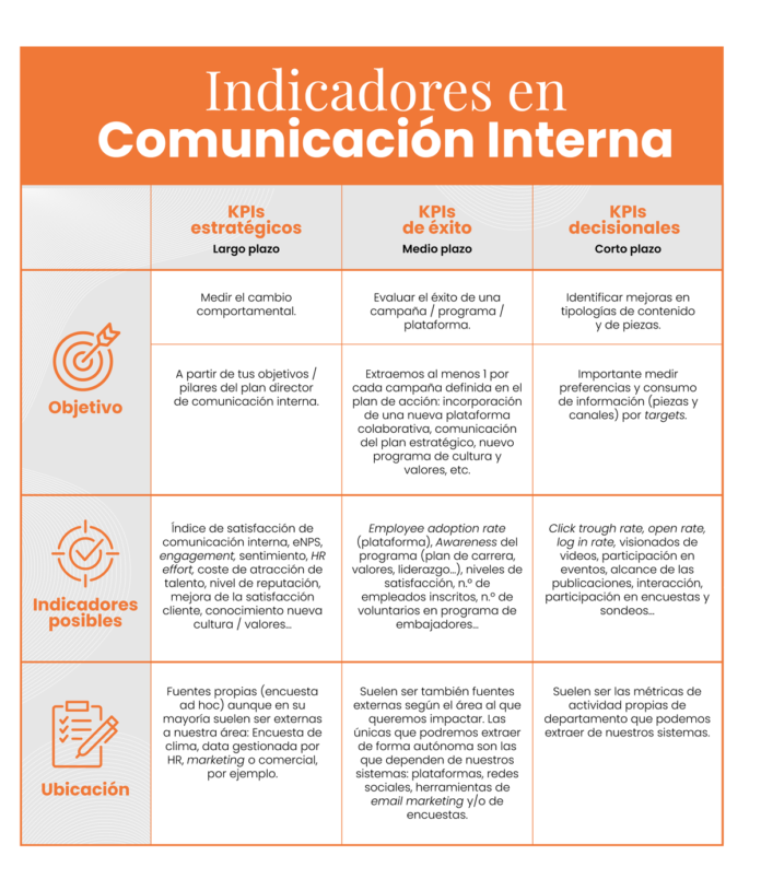 También se podrían tener en cuenta otros indicadores, como el número de visualizaciones de vídeos internos, el alcance y la interacción en publicaciones corporativas y la participación en encuestas y sondeos.