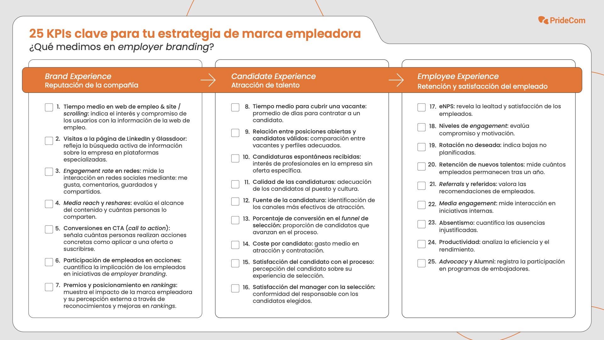 El employer branding ya no se mide solo por número de candidaturas o interacciones en redes. Apunta estos 25 indicadores clave que se centran en experiencia y compromiso. Te permitirán ajustar la estrategia en tiempo real y maximizar engagement y fidelización.